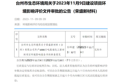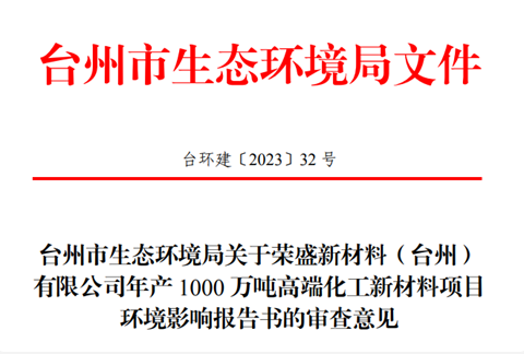 近日,臺州市生態(tài)環(huán)境局發(fā)布關(guān)于2023年11月9日建設(shè)項(xiàng)目環(huán)境影響評價文件審批的公告(榮盛新材料 ),在項(xiàng)目符合產(chǎn)業(yè)政策、選址符合國土空間規(guī)劃等相關(guān)規(guī)劃的前提下,原則同意《環(huán)評報告書》結(jié)論。