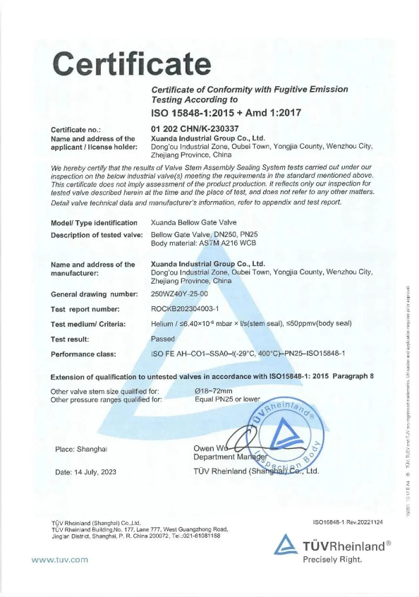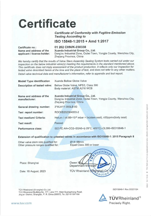 API641和IS015848-1低泄漏認證是國際上權威的閥門低泄漏產(chǎn)品認證。通過本次產(chǎn)品認證,充分證明了宣達實業(yè)在閥門設計和制造過程中嚴格遵循國際標準,產(chǎn)品的低逸散性能達到行業(yè)領先水平。