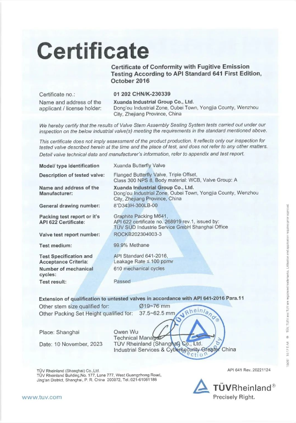 宣達實業(yè)集團金屬硬密封蝶閥、波紋管閘閥和波紋管截止閥在德國TUV萊茵的見證下,成功通過了API641以及ISO15848-1:2015( CO2級)低泄漏產(chǎn)品型式試驗。