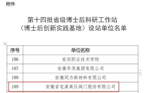 近日,安徽省人社廳發(fā)布了《關(guān)于批準(zhǔn)數(shù)據(jù)空間研究院等110家單位設(shè)立第十四批省級博士后科研工作站的通知》。經(jīng)區(qū)、市人力資源和社會保障局推薦、現(xiàn)場答辯等多環(huán)節(jié)嚴(yán)格送選,安徽省屯溪高壓閥門股份有限公司成功獲批設(shè)立省級博士后科研工作站。