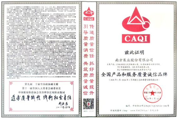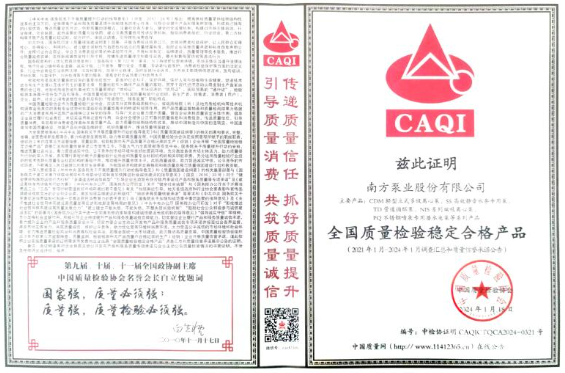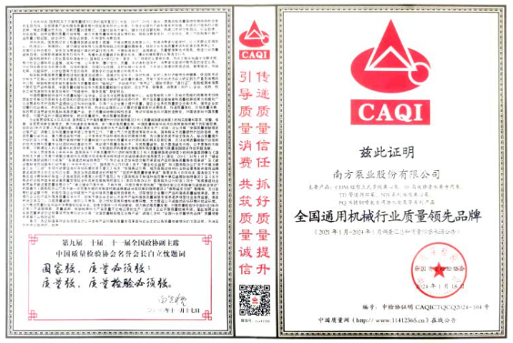 近日,中金環(huán)境旗下南方泵業(yè)股份有限公司在中國質量檢驗協(xié)會舉辦的“產品和服務質量誠信承諾”主題活動中,正式通過了審核組專家對相關體系文件和主要產品的全面審核,取得了“全國通用機械行業(yè)質量領先品牌”“全國質量檢驗穩(wěn)定合格產品”“全國產品和服務質量誠信品牌”評定證書。