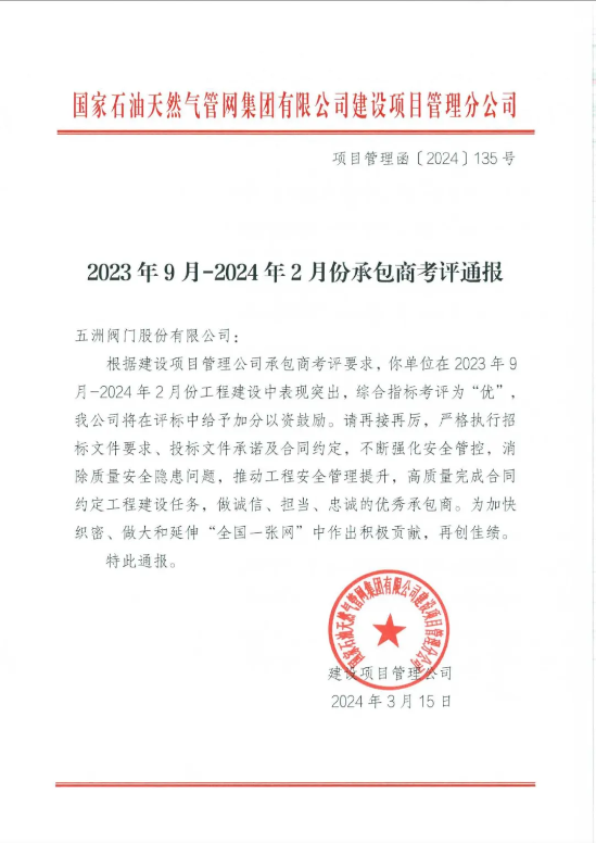 近日,國家管網(wǎng)建設項目管理公司于三月初召開了2024年承包商工作會議,并在后續(xù)公布了2023年9月至2024年2月承包商考評結果,五洲閥門股份有限公司被評為“優(yōu)秀承包商”!