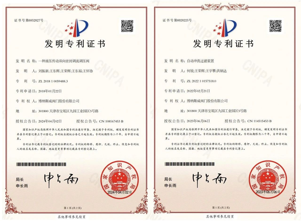 近期,博納斯威的自動(dòng)沖洗過(guò)濾裝置、軸流式雙級(jí)雙向調(diào)節(jié)閥、閥桿水平驅(qū)動(dòng)式偏心半球閥、對(duì)沖消能軸流式角旋等八項(xiàng)新技術(shù),先后獲得國(guó)家知識(shí)產(chǎn)權(quán)局授權(quán)發(fā)明專利!以上八種新技術(shù),分別在水系統(tǒng)閥門領(lǐng)域關(guān)斷、止回、調(diào)節(jié)、水錘防護(hù)以及特殊功能方面均有突破性進(jìn)展。