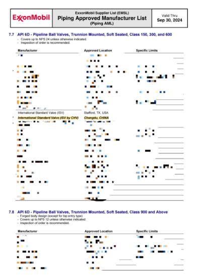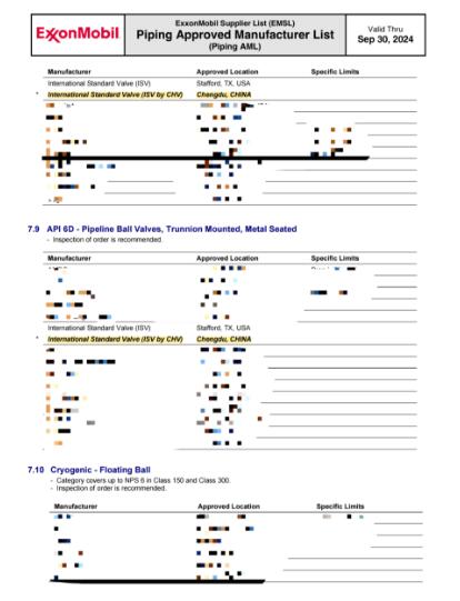 在美國??松梨?ExxonMobil)最新發(fā)布的批準(zhǔn)供應(yīng)商列表(AML)中,成都成高閥門股份有限公司(CHV)在以下產(chǎn)品分類中獲得正式批準(zhǔn):