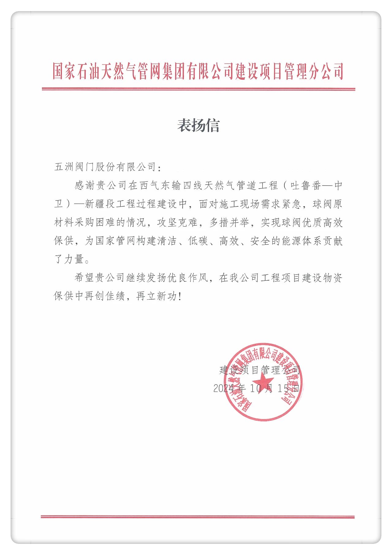 近日,五洲閥門股份有限公司收到國家石油天然氣管網(wǎng)集團發(fā)來的感謝信,感謝公司在西氣東輸四線天然氣管道工程 (吐魯番-中衛(wèi))--新疆段項目提供了強有力的支持,更對公司能夠"攻堅克難、多措并舉"的為國家管網(wǎng)保供低碳、高效安全的閥門物資給予高度的認可及感謝。