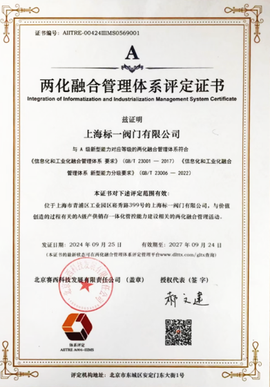 此次通過兩化融合認證,不僅是對標一閥門長期以來努力的肯定,更讓公司在激烈的市場競爭中占據(jù)了先機。這將進一步提升標一閥門在行業(yè)內(nèi)的影響力,為客戶提供更優(yōu)質(zhì)、更可靠的閥門產(chǎn)品和更高效的服務。同時,也為公司未來在智能制造領域的持續(xù)拓展和創(chuàng)新提供了有力的支撐,激勵著標一閥門向著更高的目標奮勇前行,成為閥門行業(yè)兩化融合發(fā)展的卓越典范。