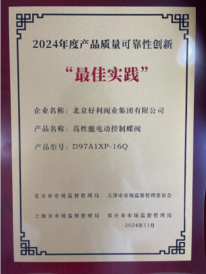 北京好利集團(tuán)自主研發(fā)的高性能電動(dòng)控制蝶閥成功斬獲“2024年度產(chǎn)品質(zhì)量可靠性創(chuàng)新最佳實(shí)踐”獎(jiǎng)項(xiàng)。