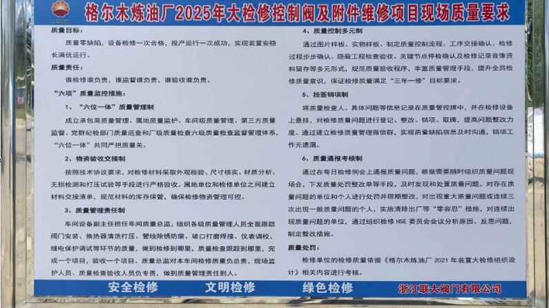 2025年8月,浙江聯(lián)大閥門有限公司承接格爾木煉油廠大檢修控制閥及附件維修項(xiàng)目,涉及565臺閥門,其中415臺控制閥下線檢修、150臺控制閥在線檢修。面對任務(wù)規(guī)模大、標(biāo)準(zhǔn)要求高的挑戰(zhàn),浙江聯(lián)大閥門迅速組建項(xiàng)目團(tuán)隊(duì),第一時(shí)間奔赴現(xiàn)場,以安全檢修、文明檢修、綠色檢修為核心原則,全面推進(jìn)檢修工作。