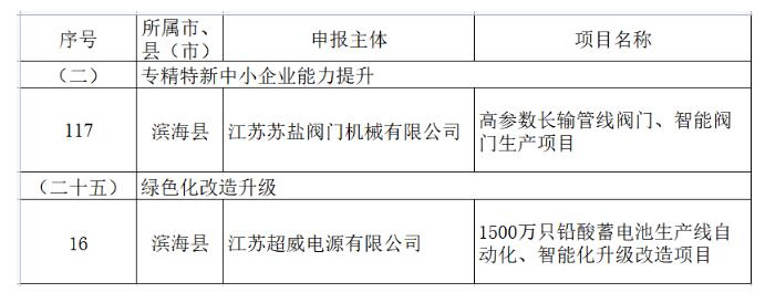 江蘇蘇鹽閥門機(jī)械有限公司憑借“高參數(shù)長(zhǎng)輸管線閥門、智能閥門生產(chǎn)項(xiàng)目”獲得“專精特新中小企業(yè)能力提升”資金;江蘇超威電源有限公司憑借1500萬(wàn)只鉛酸蓄電池生產(chǎn)線自動(dòng)化、智能化升級(jí)改造項(xiàng)目獲得“綠色化改造升級(jí)”資金。