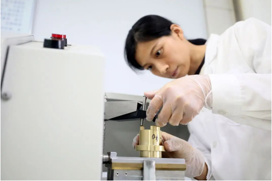 7月7日,河北省隆堯縣遠大閥門集團檢測中心,檢測人員利用光譜儀對產(chǎn)品材料進行化學成分檢測。
