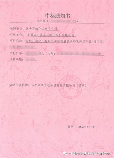 安徽省屯溪高壓閥門股份有限公司在過去的多年間一直積極參與石油化工領(lǐng)域的合作,并致力于提供高質(zhì)量的閥門產(chǎn)品和解決方案。這次振華石油化工有限公司丙烷脫氫及環(huán)氧丙烷項(xiàng)目閥門采購中標(biāo)通知書的到來,無疑是對我公司技術(shù)實(shí)力和服務(wù)水平的認(rèn)可與肯定。