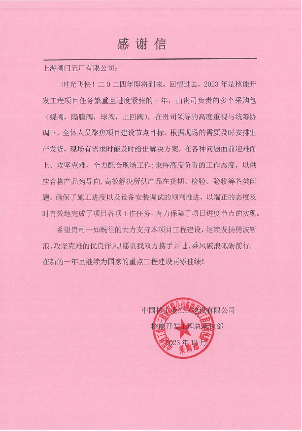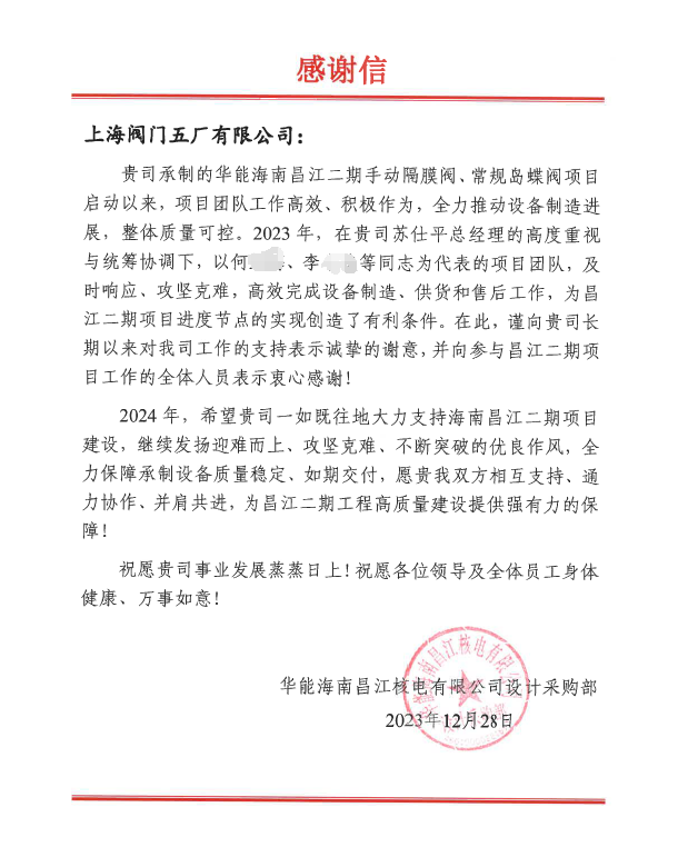 自2020年以來,上海閥門五廠有限公司依托核工業(yè)領域的項目,在不斷開發(fā)產(chǎn)品的同時,還大力開展數(shù)字化建設工作自行開發(fā)了適用核質量管理和項目執(zhí)行的應用,取得一定成果。其中在執(zhí)行中國核工業(yè)二三建設公司的核能開發(fā)項目和華能海南昌江核電的隔膜閥和蝶閥項目中分別獲得了客戶的認可,收到客戶發(fā)來的感謝信。