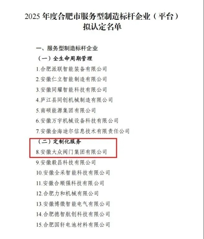 近日,合肥市工業(yè)和信息化局公示2025年度合肥市服務(wù)型制造標(biāo)桿企業(yè)(平臺(tái))擬定名單,安徽大眾閥門集團(tuán)有限公司憑借在“制造+服務(wù)+解決方案”領(lǐng)域的深厚積淀與突出成效成功入選,這一榮譽(yù)標(biāo)志著公司在由傳統(tǒng)制造向服務(wù)型制造轉(zhuǎn)型的道路上取得了重要進(jìn)展。