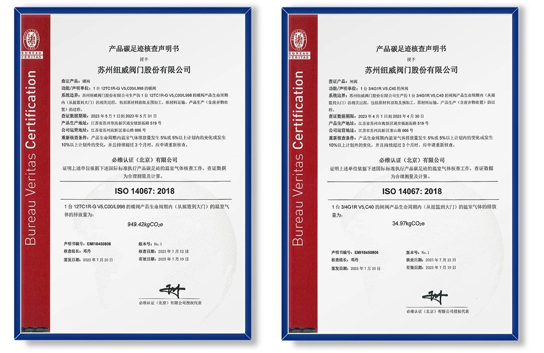 為順應(yīng)環(huán)保發(fā)展趨勢,紐威閥門的閘閥與蝶閥兩款產(chǎn)品順利通過認(rèn)證機(jī)構(gòu)BV公司的碳足跡核查認(rèn)證,獲得ISO14067碳足跡認(rèn)證證書。