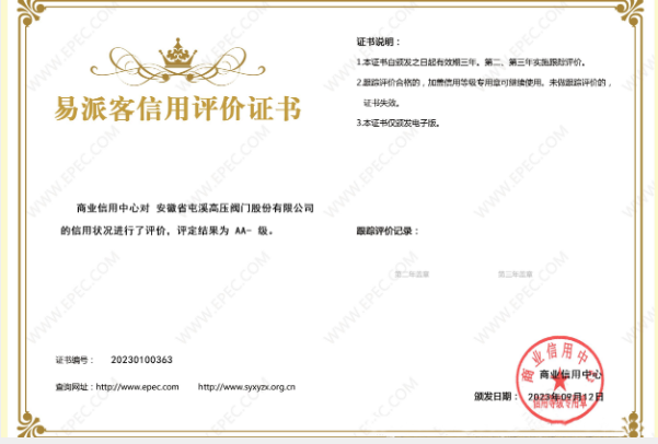 安徽省屯溪高壓閥門(mén)股份有限公司近期參與了易派客信用評(píng)價(jià),并成功升級(jí)至AA-級(jí)別。這一升級(jí)標(biāo)志著屯閥公司在過(guò)去幾年中取得的巨大成就和優(yōu)秀表現(xiàn)再次得到了外界的認(rèn)可。